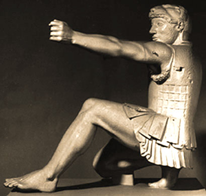 Herakles kneeling to shoot with a bow. He wears a lion-head helmet and a skirted leather cuirass.