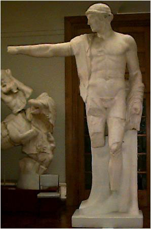 Apollo observes the battle between Lapiths and Centaurs at the wedding of Peirithoos. His head is turned to the right and his gaze follws his outstretched right arm. A bow was added separately in his left hand.