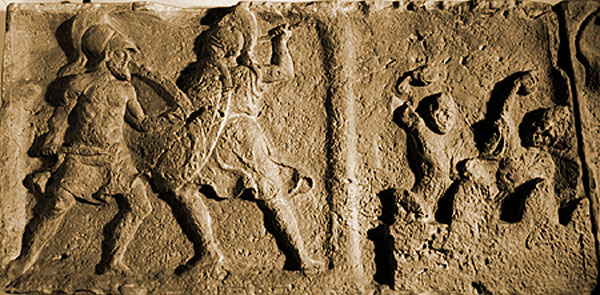 Warriors fighting on the walls of a besieged city. On the right, the defenders throw rocks down at the attacking army.
