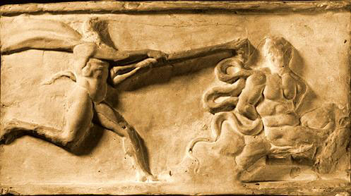 Satyr, wearing a panther skin, brandishing a torch and running towards a bound pirate who has been bitten by a snake on the right shoulder.