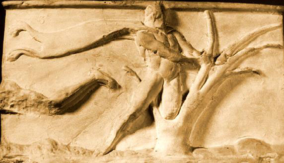 Satyr, wearing a panther skin, tearing a branch from a tree.