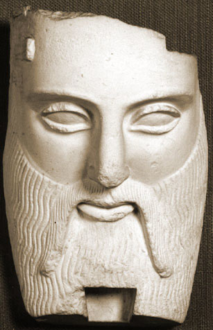 Face of a god, possibly the river-god Acheloos. Horns were attached at the forehead.