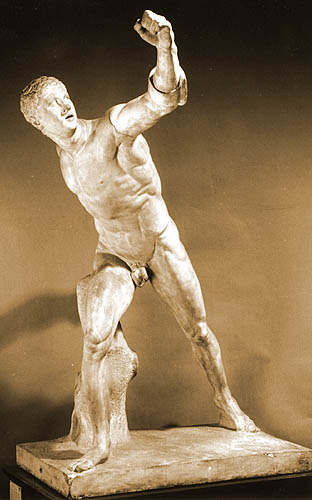 A warrior warding off a blow. He once held a shield on his left arm, and a sword in his right hand,