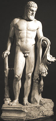 Herakles, bearded, with right hand resting on his club. He carries a lion-skin over his left arm.