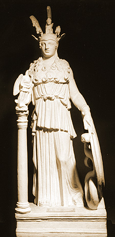 Athena wearing a helmet, and aigis decorated with a head of Gorgo. Her right hand rests on a column and holds a figure of Nike. Her left hand rests on a shield emblazoned with a head of Gorgo. A snake is coiled inside the shield.