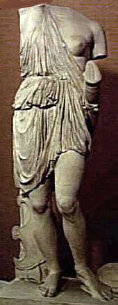 Amazon wearing a quiver and one ankle-spur. Probably once with right arm reaching up and left over her head, holding a spear at her side.