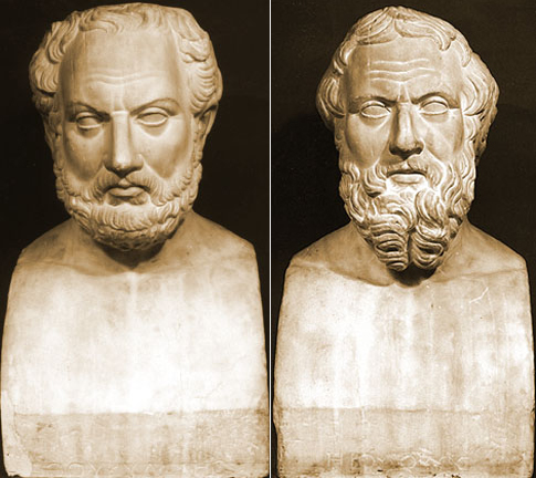 A double herm with portrait heads of Thukydides (left) and Herodotos (right).