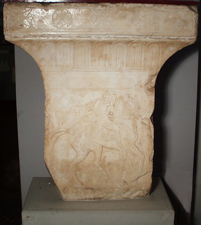 Capital of a grave monument showing a horseman leading a second horse, and mourning man and woman.