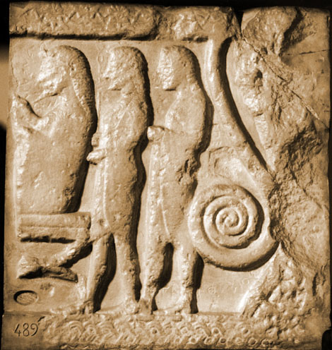 On the right; a griffin's head and neck, only the spiral plume from the head now remains.