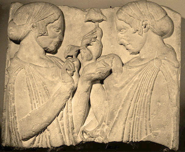 Two girls holding flowers. The girl on the left also holds a purse, and the one on the right possibly fruit.