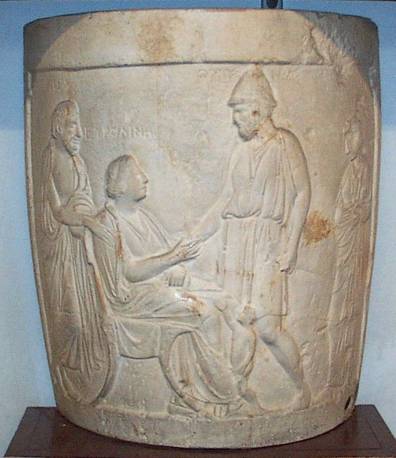 Funerary lekythos: Eukoline, Onesimos, Chaireas, and maid with infant.