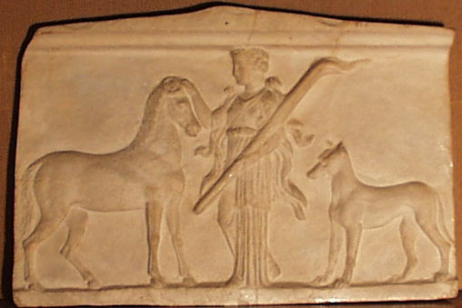 Hecate, with a hound beside her, places a wreath on the head of a mare.