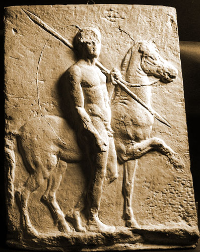 Youth with spear, leading a horse.
