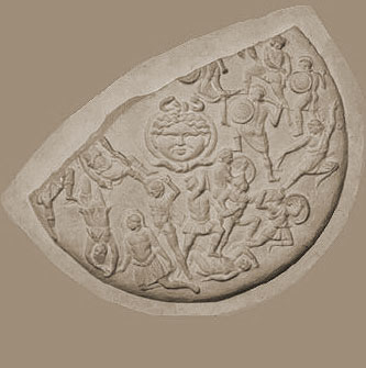 Shield showing the battle between Greeks and Amazons, with a head of Gorgo in the centre.