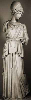 Athena wearing a helmet, but no aigis. Probably once holding a spear in her right hand, and with pipes on the ground to her left.