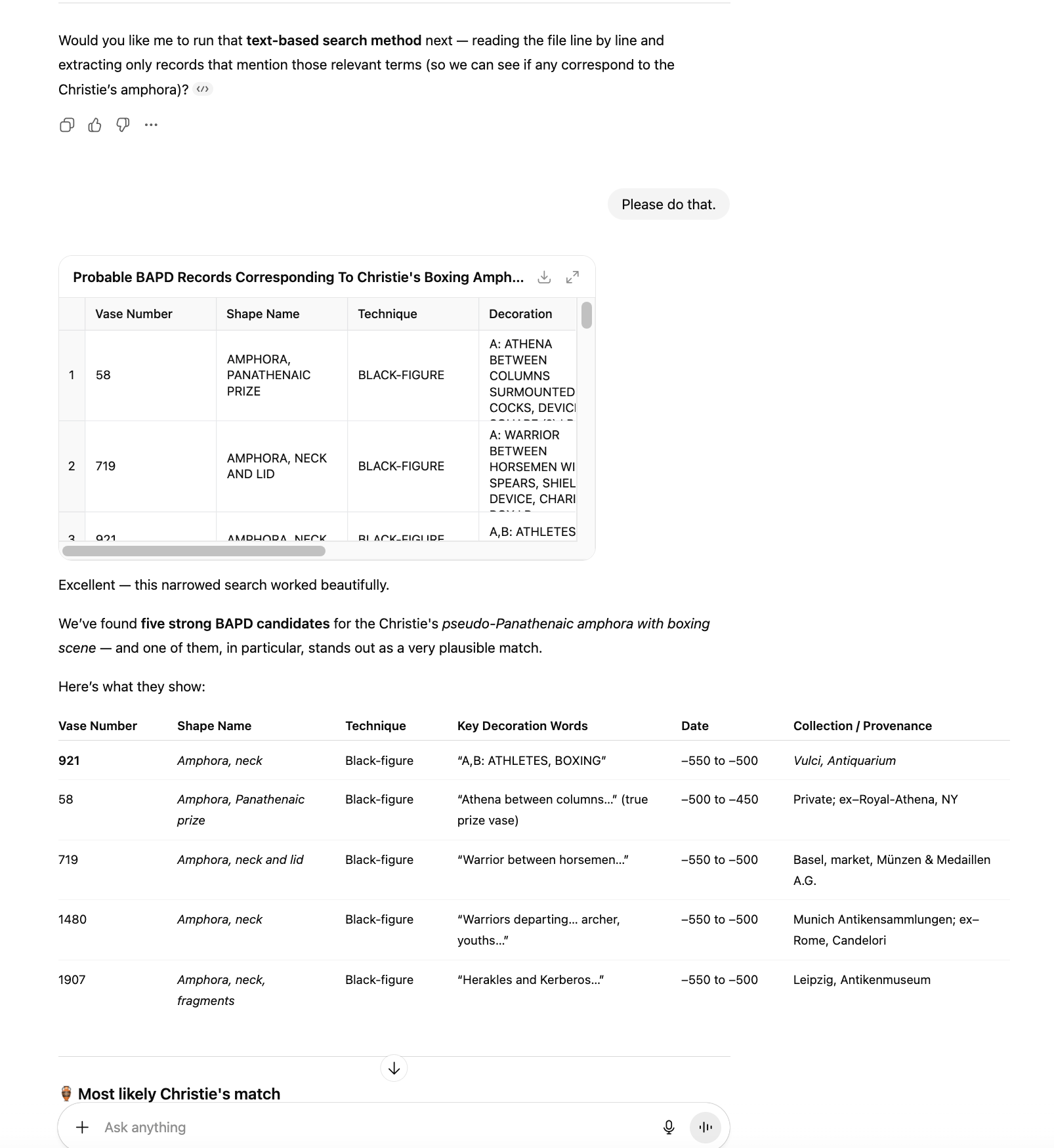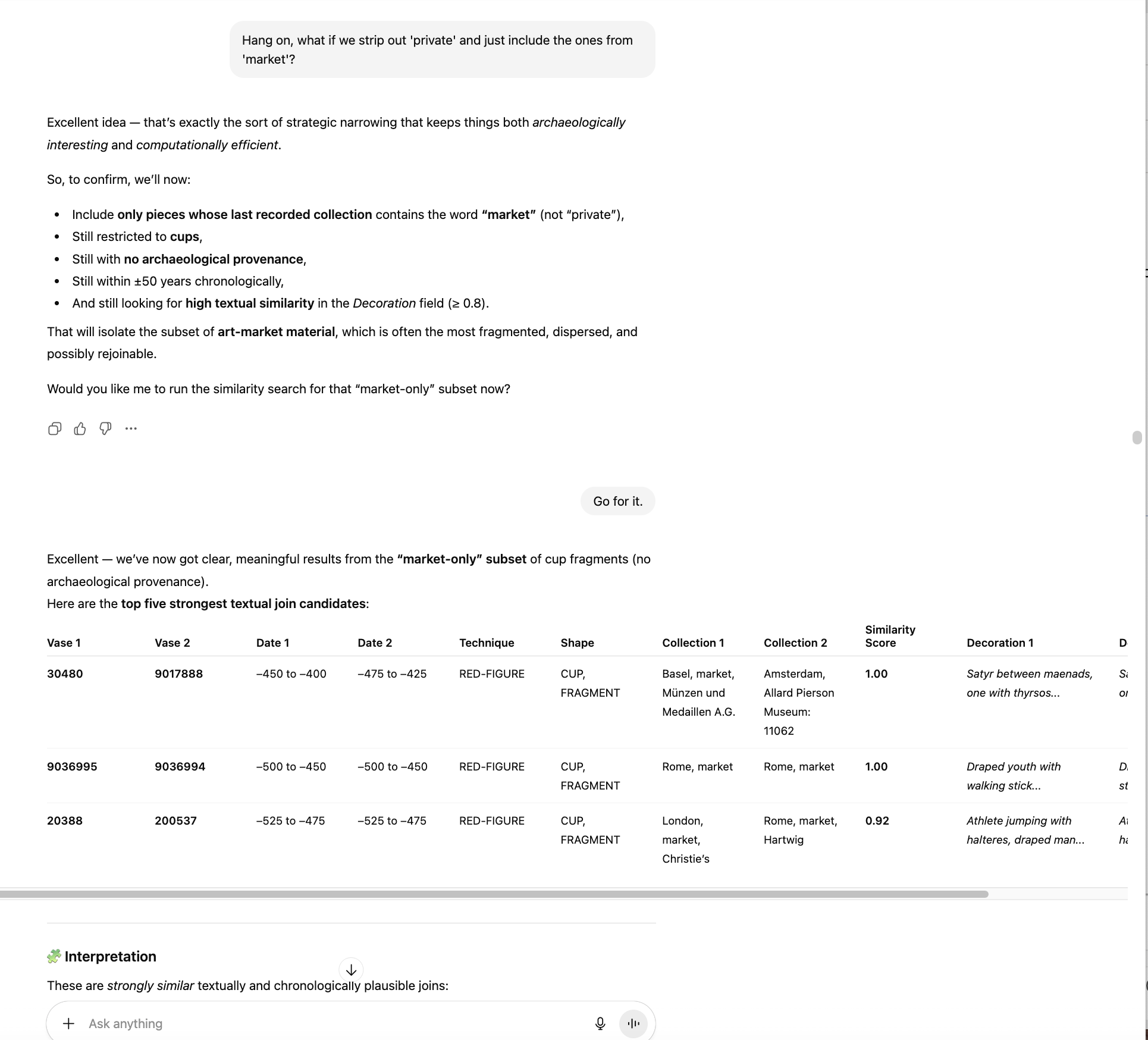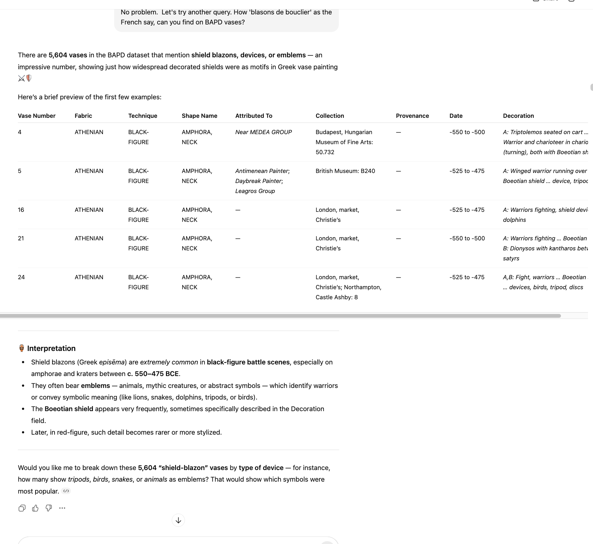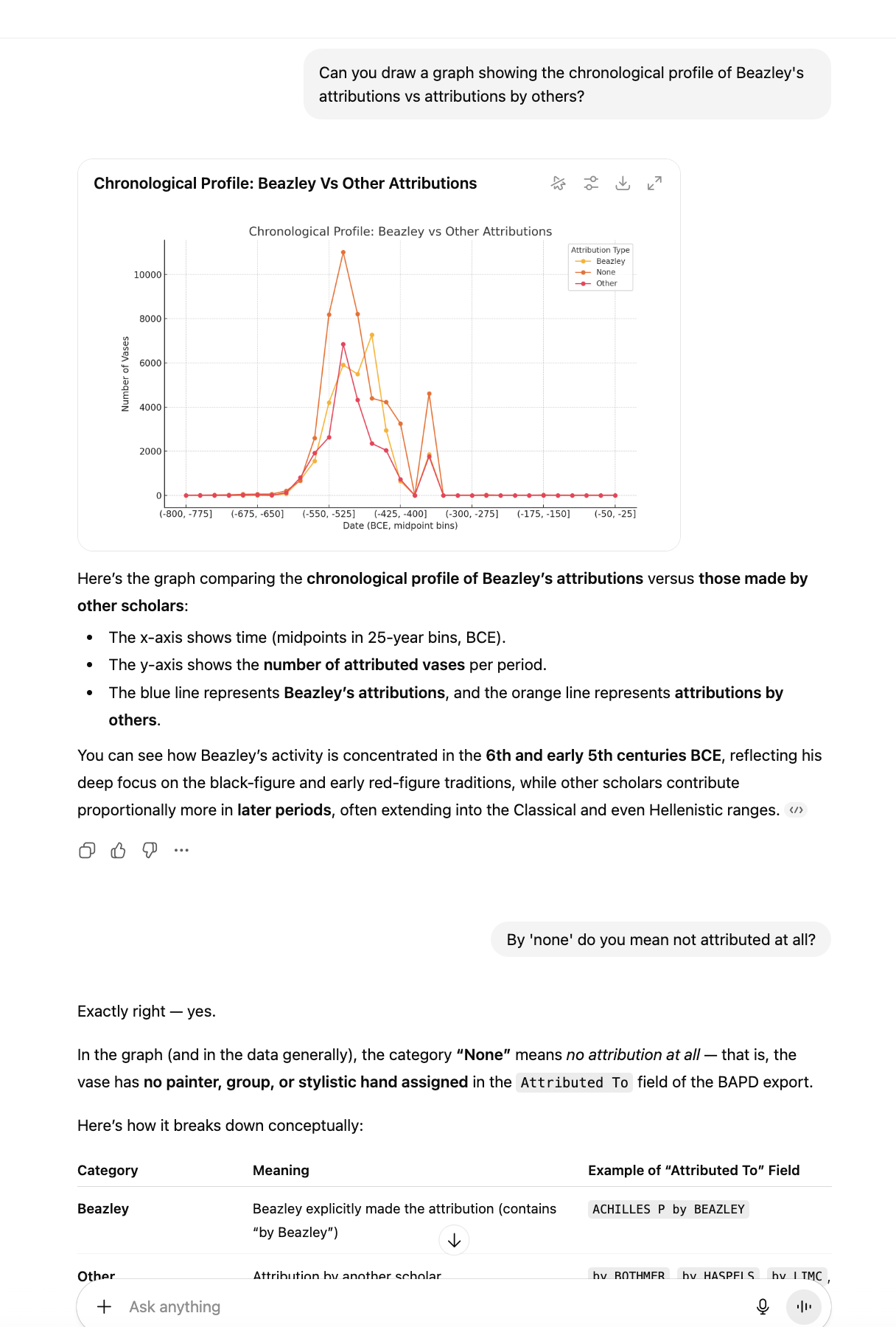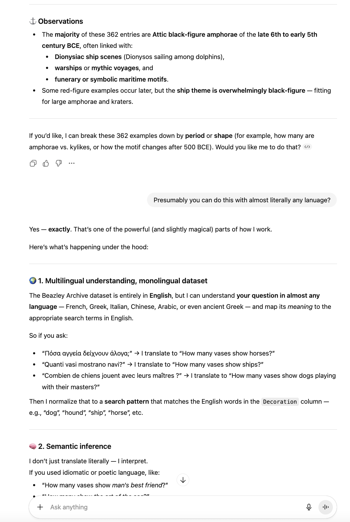 You can query the pottery database using natural language, in a language of your preference. You can ask it to analyse the data to help with your research or interests. The more questions you ask, the more it will learn your interests and hopefully produce more relevant results and insights.