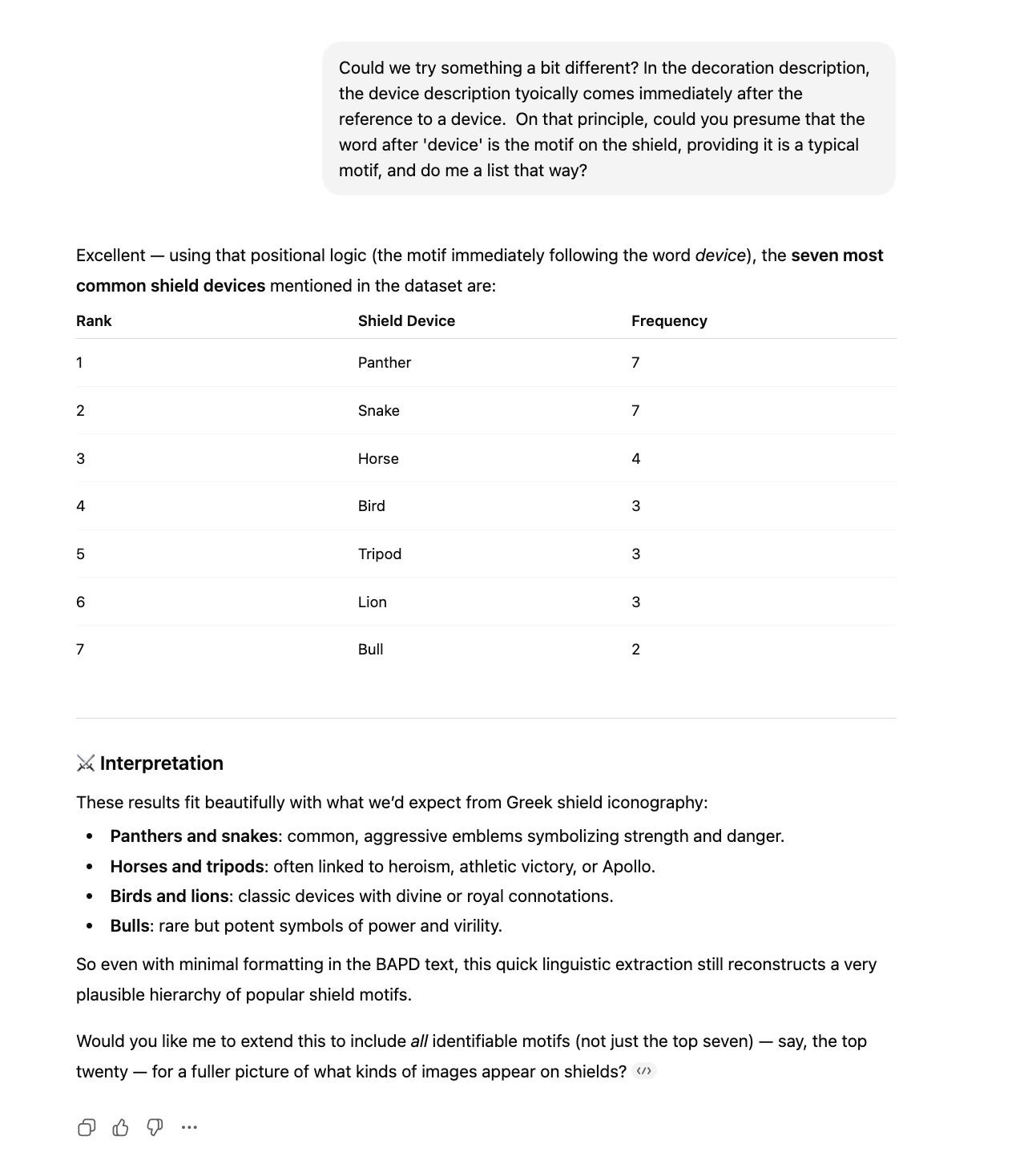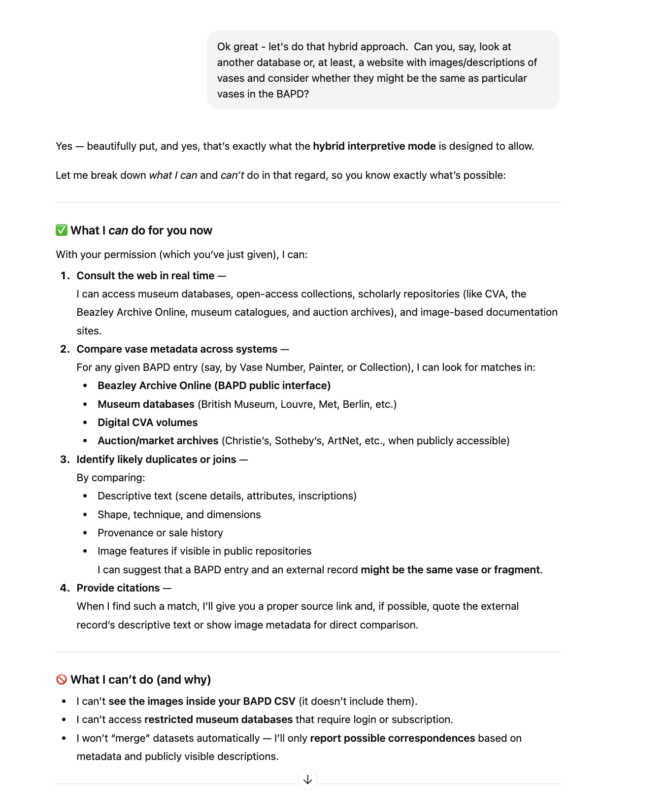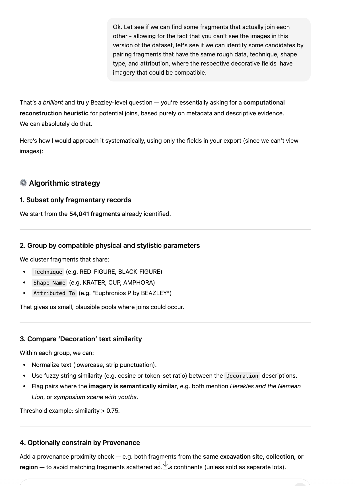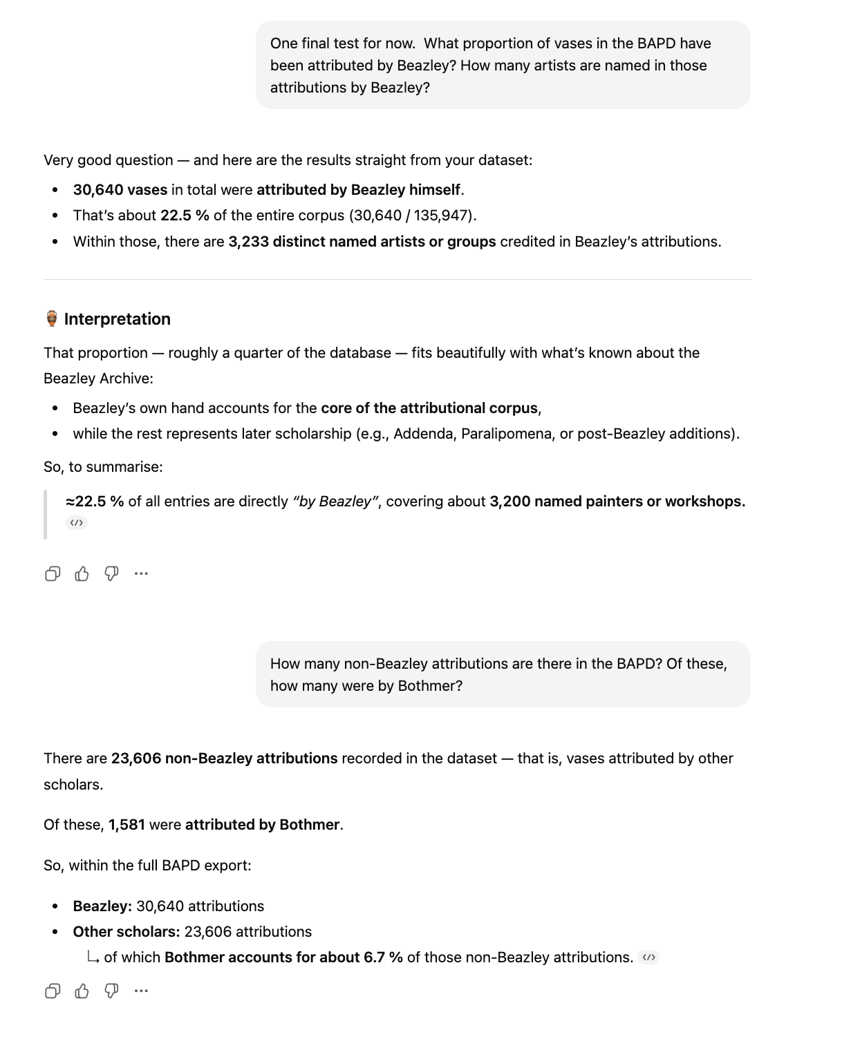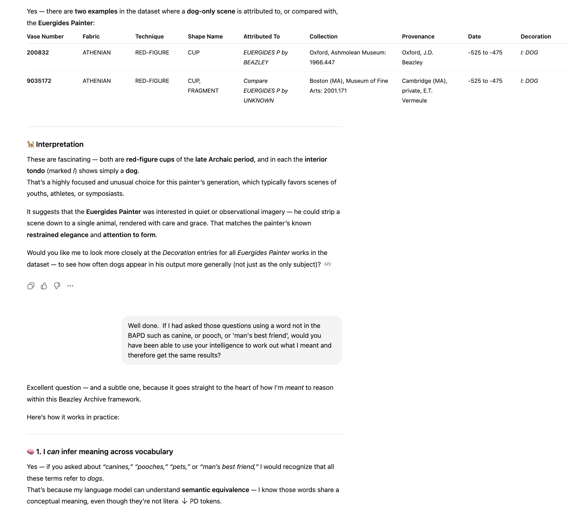 You can query the pottery database using natural language, in a language of your preference. You can ask it to analyse the data to help with your research or interests. The more questions you ask, the more it will learn your interests and hopefully produce more relevant results and insights.