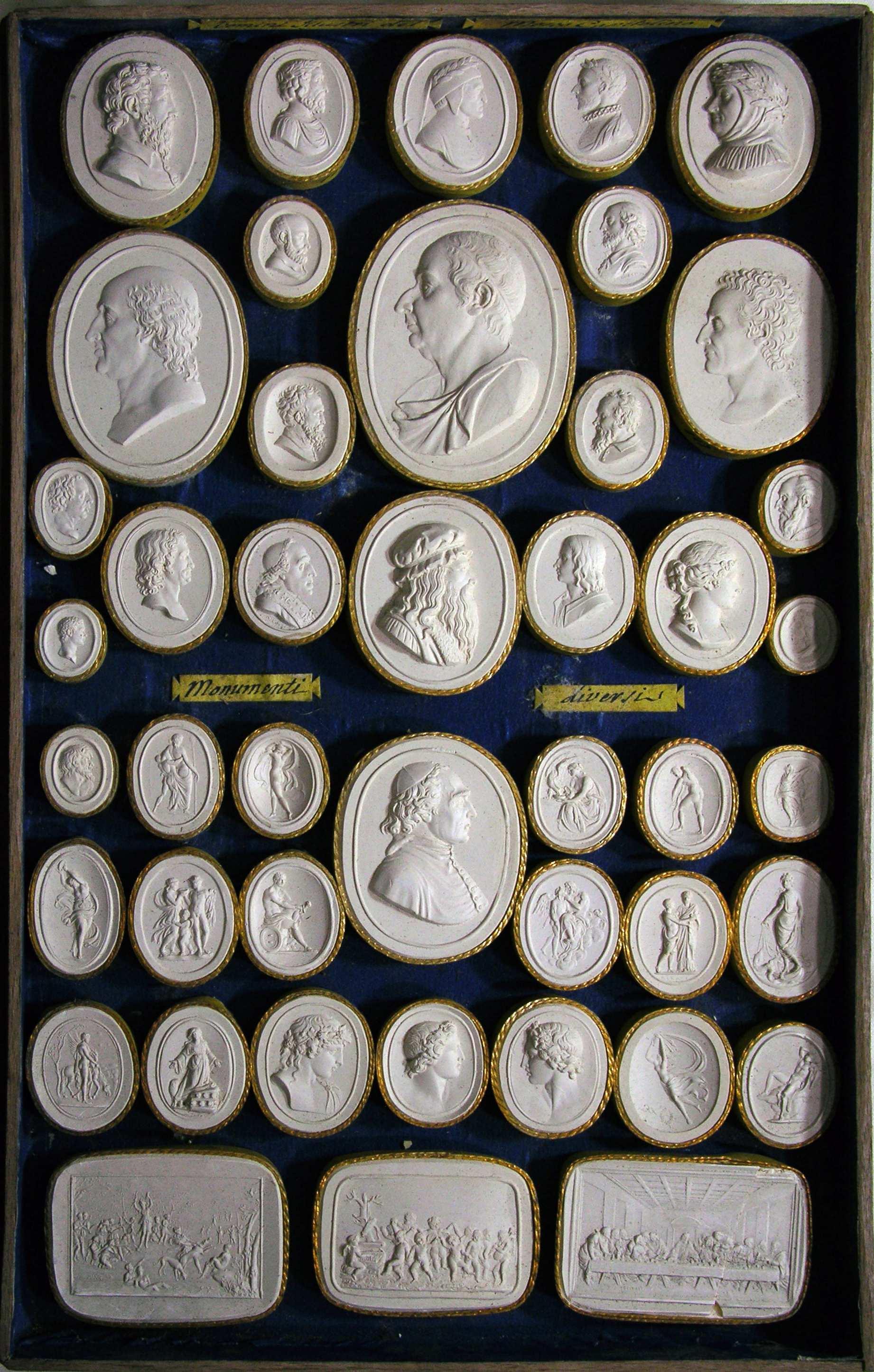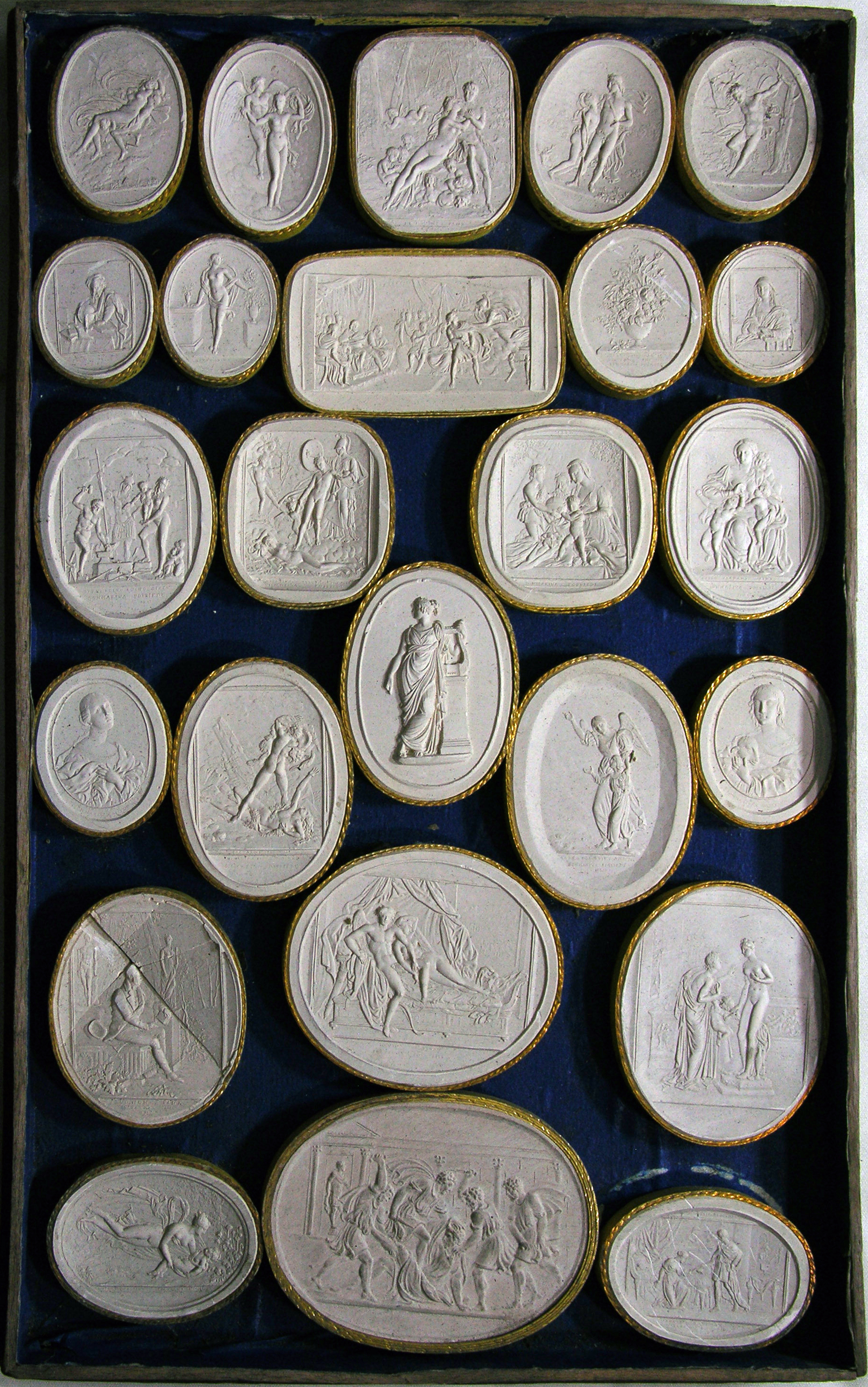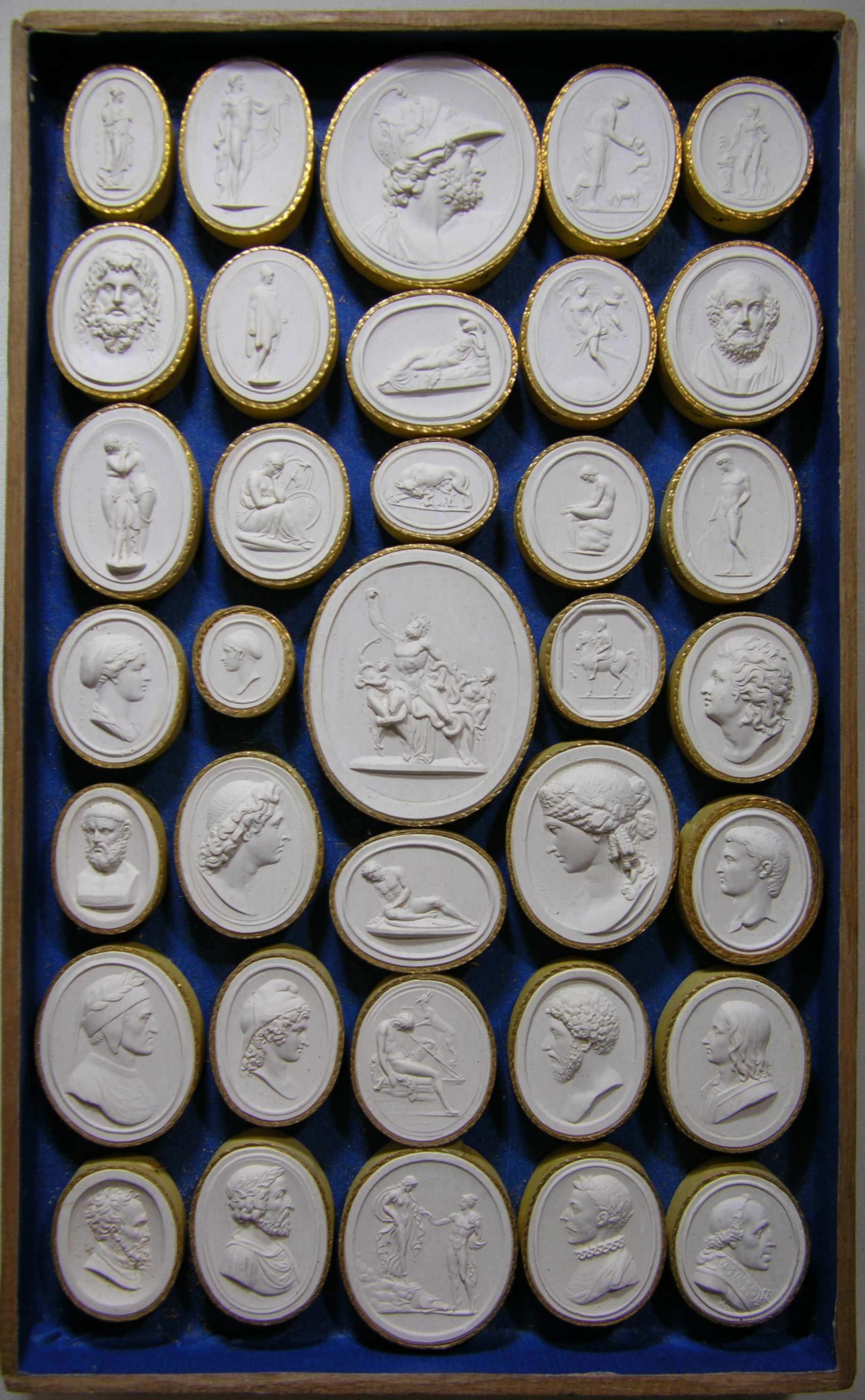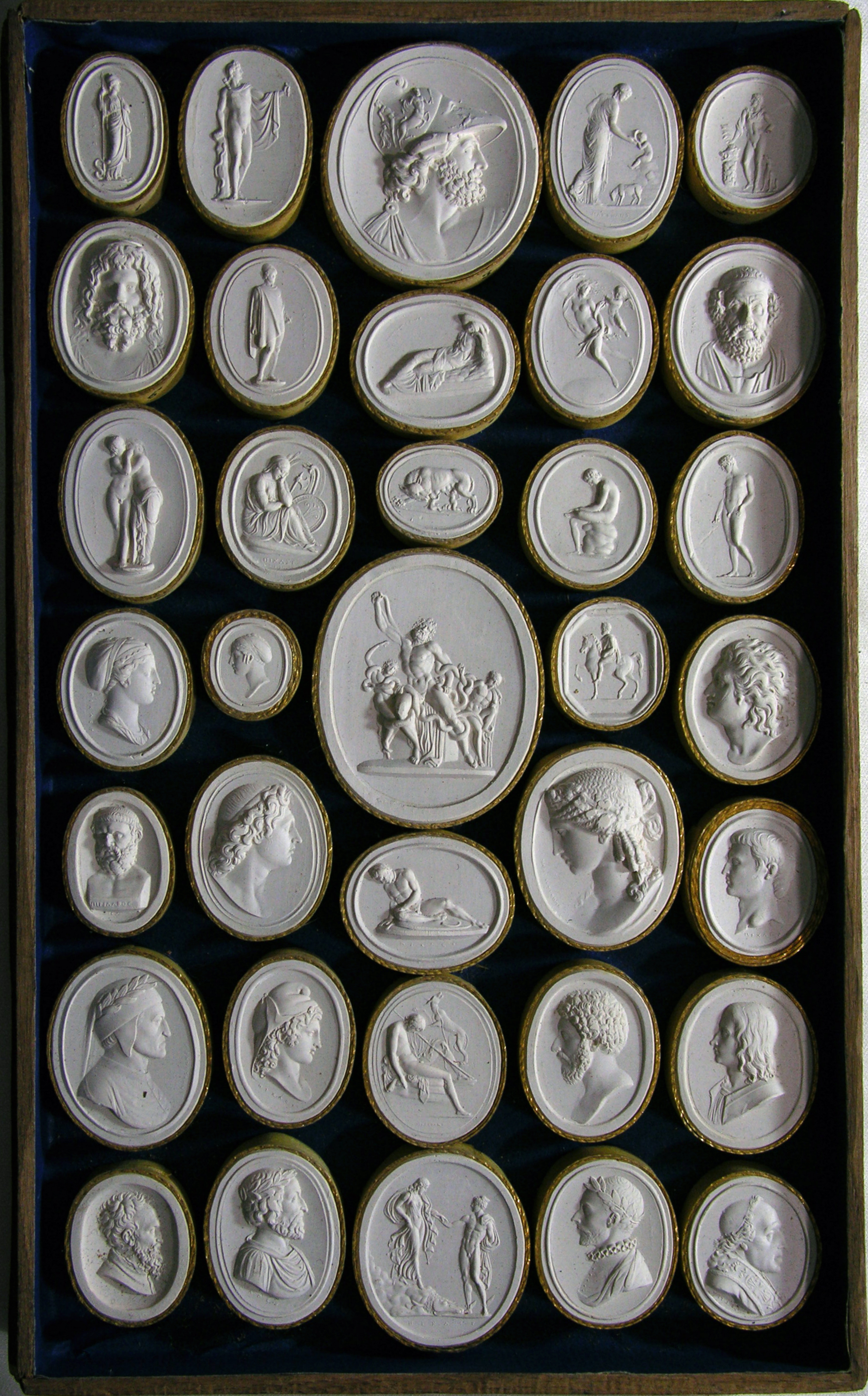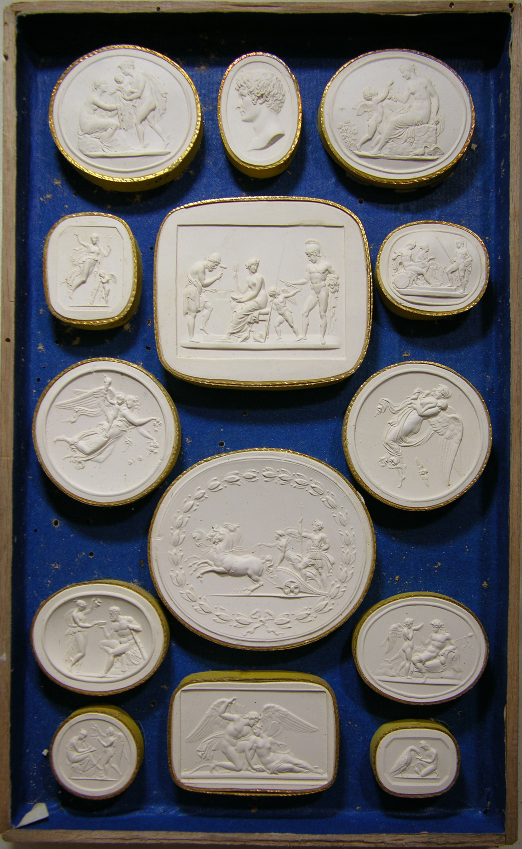Nest of 5 wooden trays (120 casts), Paoletti, numbered, mounted white plaster gems almost entirely modern (neo-classical subjects) mostly reproducing ancient sculptures but incl. Canova & Thorvaldsen on lid indecipherable MS, owner's name/address?