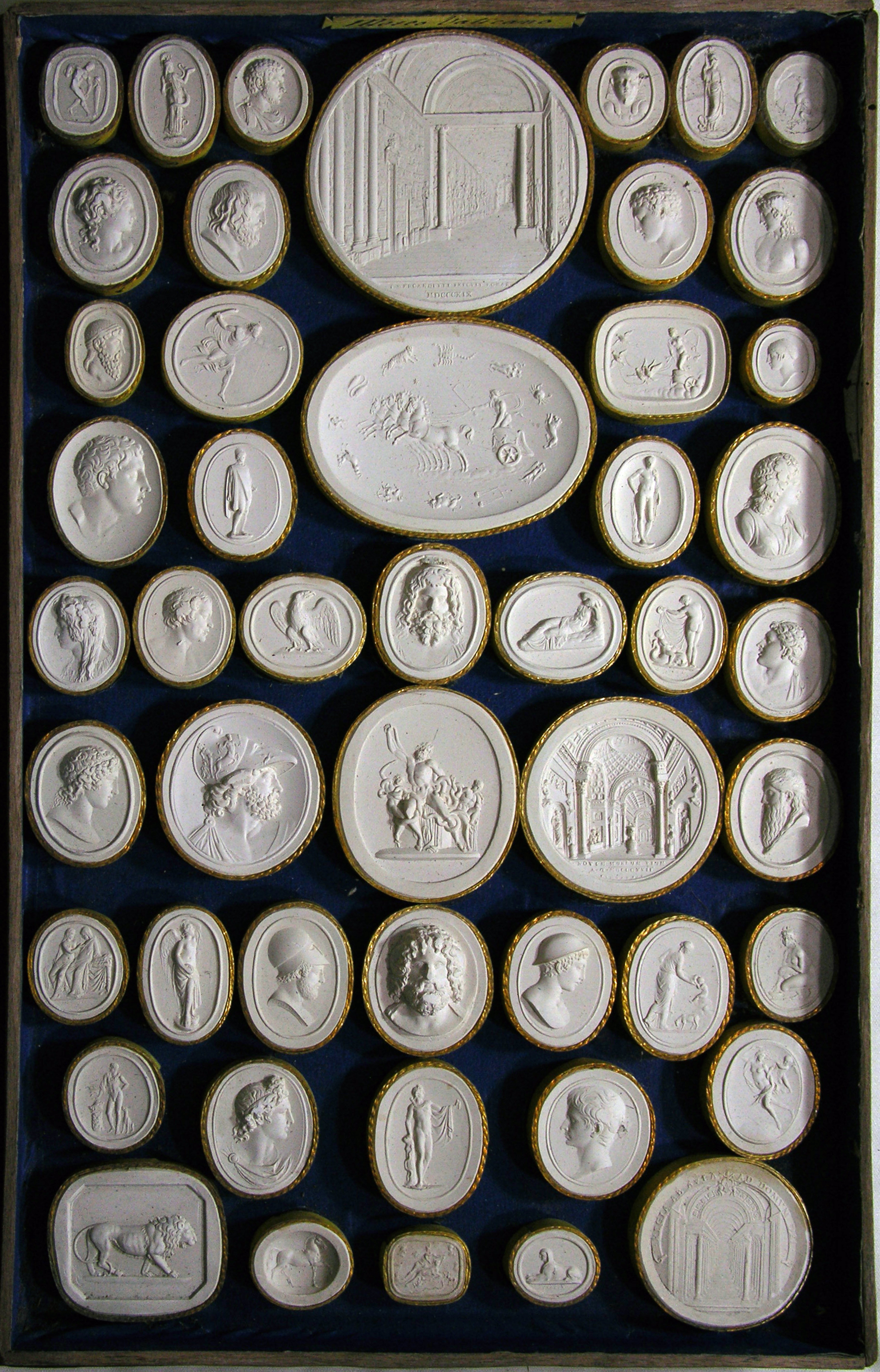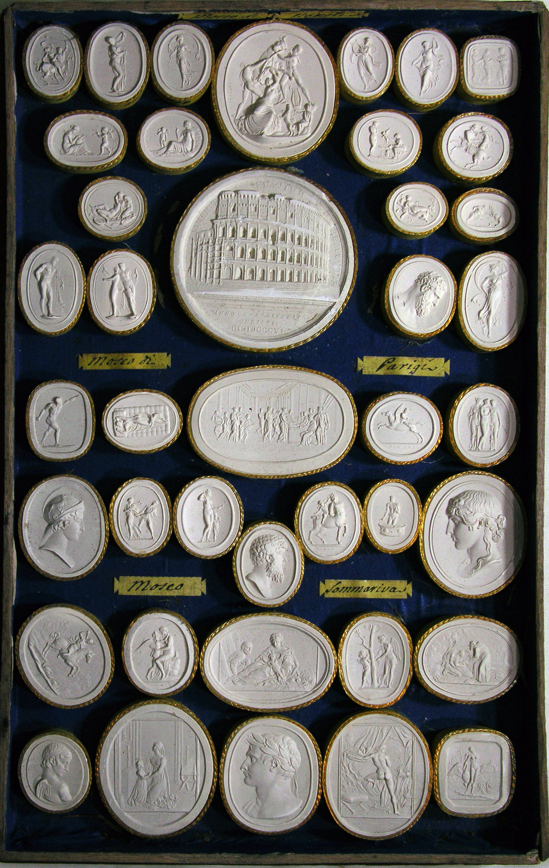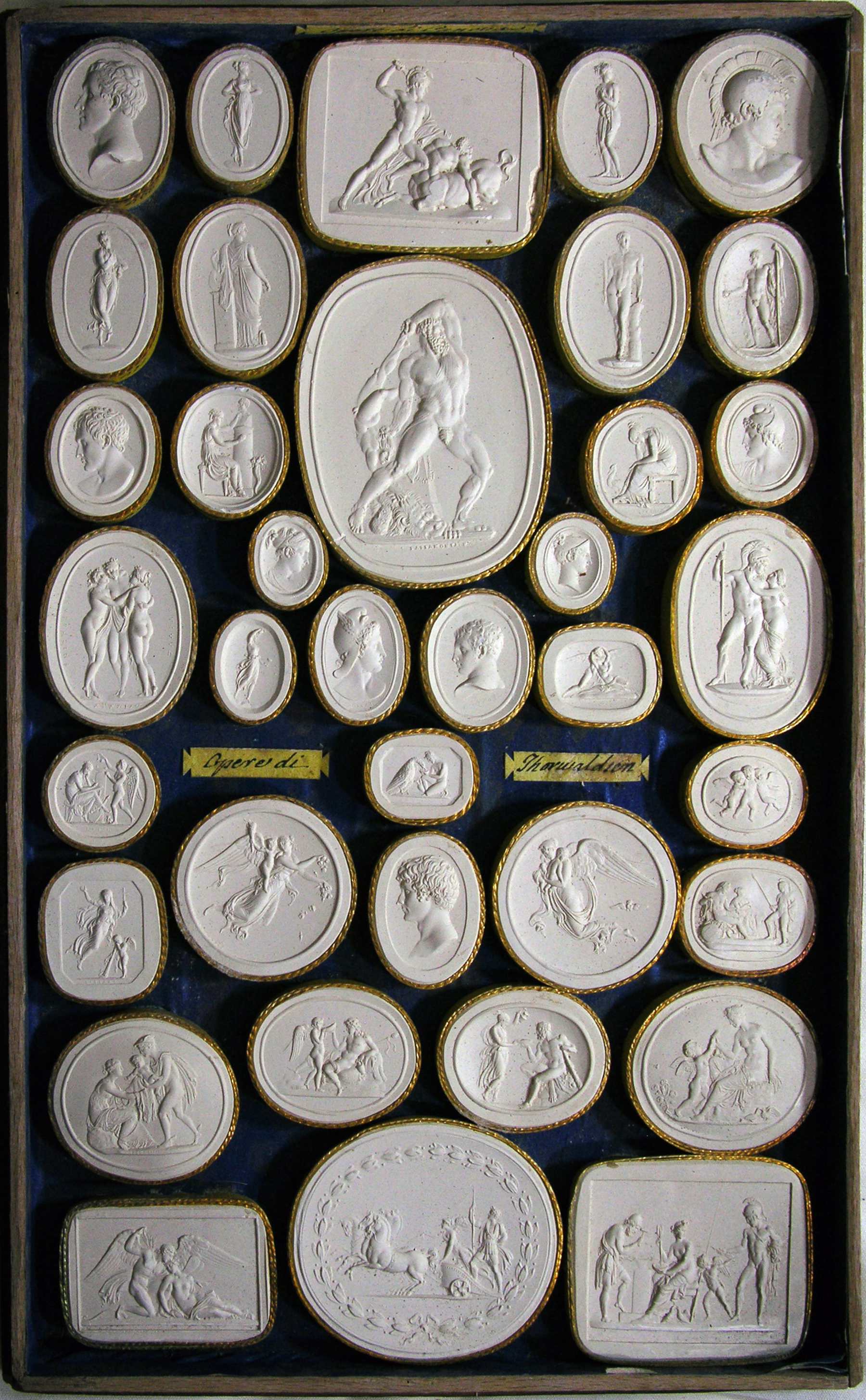 MS catalogue, Bart. Paoletti e Pietro figlio, Piazza di Spagna 49 - larger & more carefully described selection than 35. Nest of 6 wood trays+ lid (lid does not fit - from different box) (300 casts) numbered, mounted modern gems (neo-class.) subjects arranged by museums/collections of ancient statuary, also Canova & Thorvaldsen