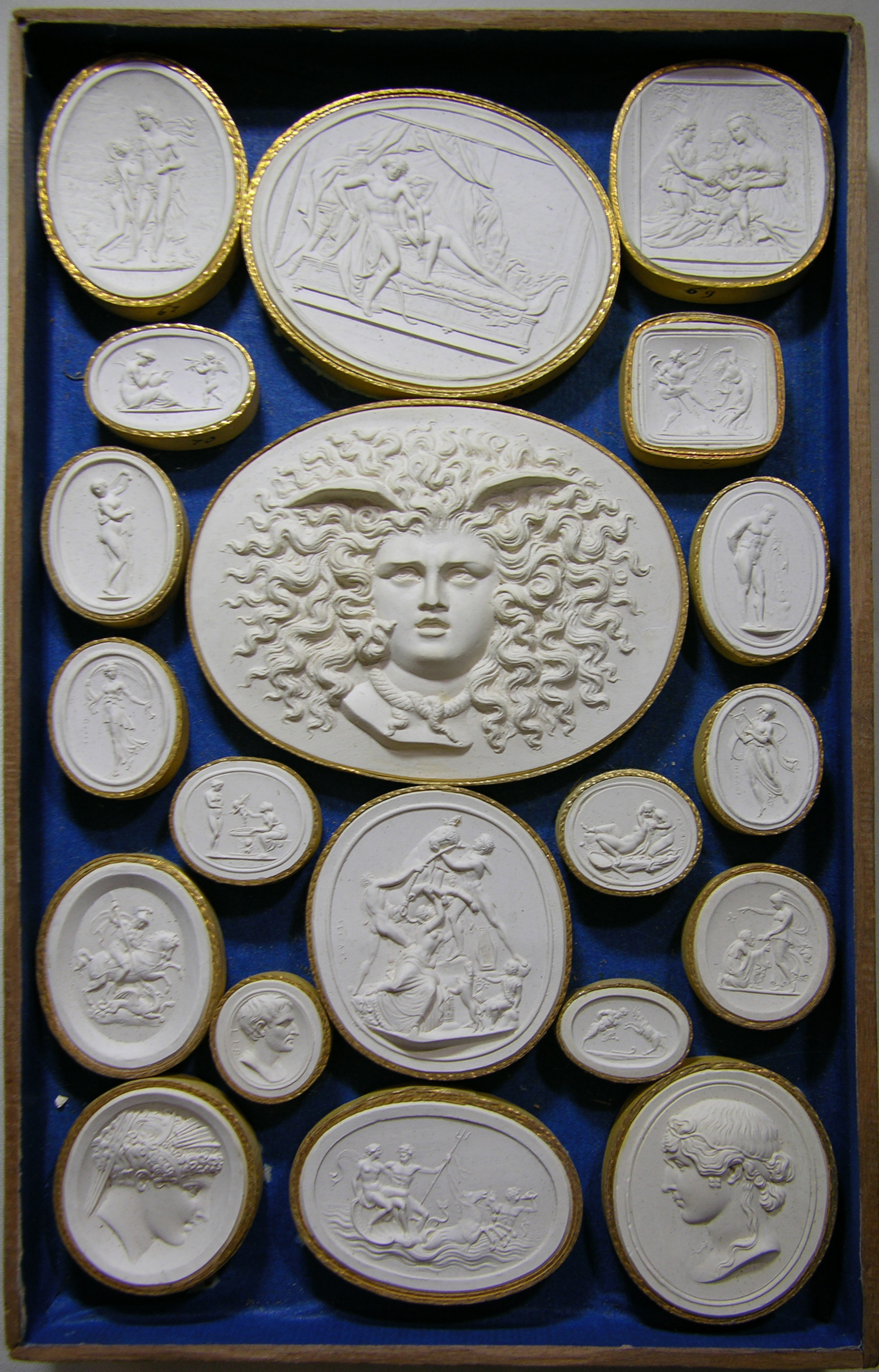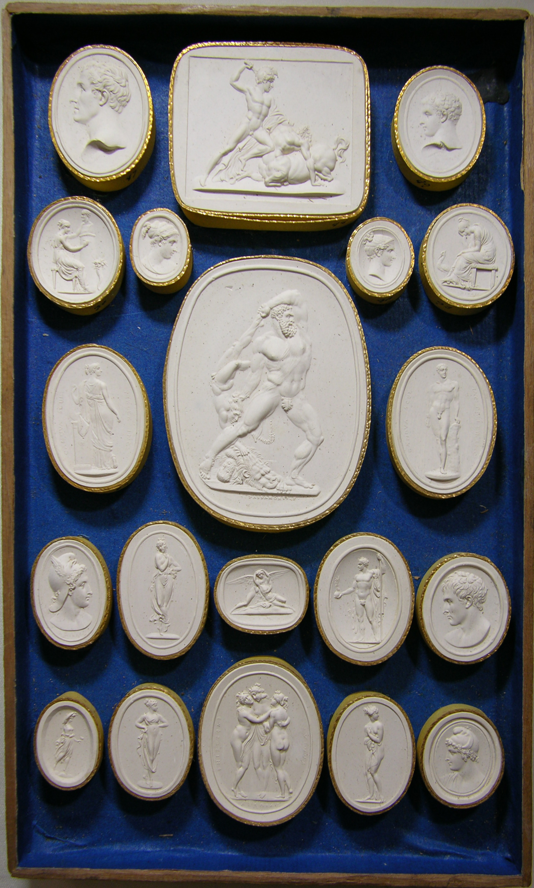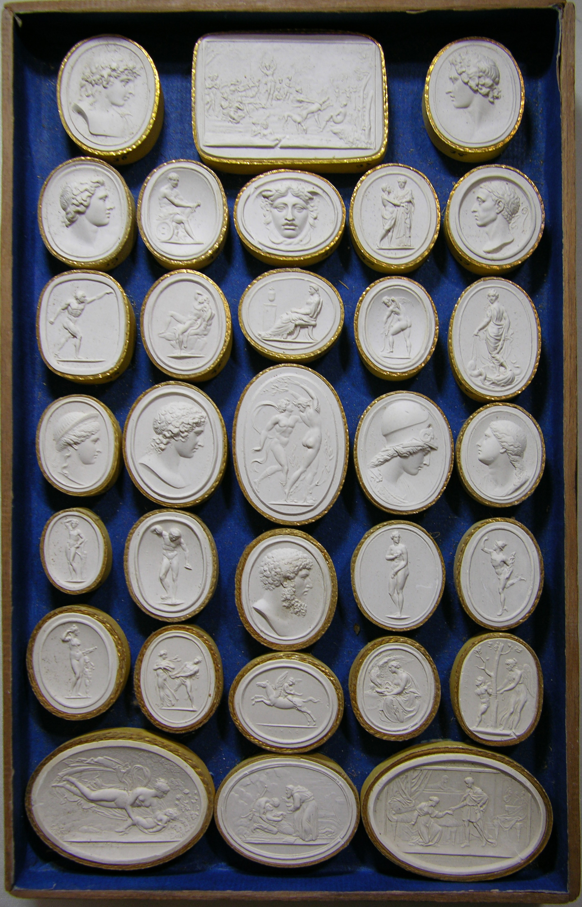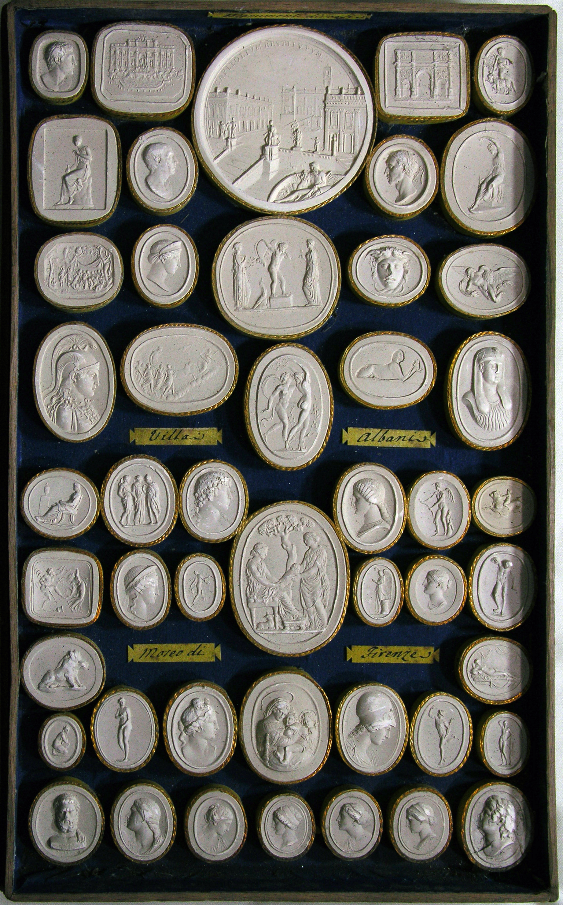MS catalogue, Bart. Paoletti e Pietro figlio, Piazza di Spagna 49 - larger & more carefully described selection than 35. Nest of 6 wood trays+ lid (lid does not fit - from different box) (300 casts) numbered, mounted modern gems (neo-class.) subjects arranged by museums/collections of ancient statuary, also Canova & Thorvaldsen