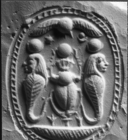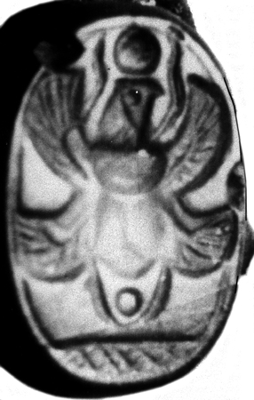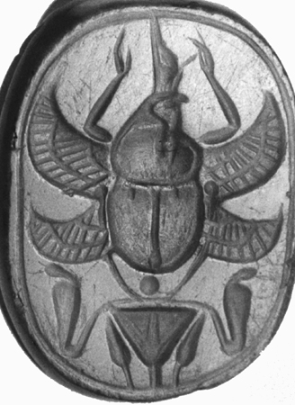 5/1 Cagliari 9466, from Tharros (Spano 8). Ebers, pl. F 16; Hölbl, Sard no. 201. BL;EXCR. Hawk-headed, four-winged beetle holds sun disc. V