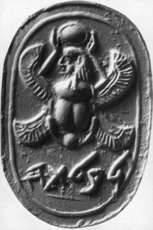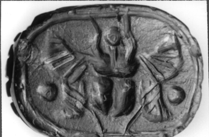5/X5 Péronne, Danicourt Collection. RA 1971, 196, fig. 2 (Boardman); Sass/Uehlinger, 122, 61, and 215-217, 88 (Gubel; Sass). Lapis lazuli scaraboid pierced laterally. BL. Human head, four wings, inscribed in Hebrew, blth.