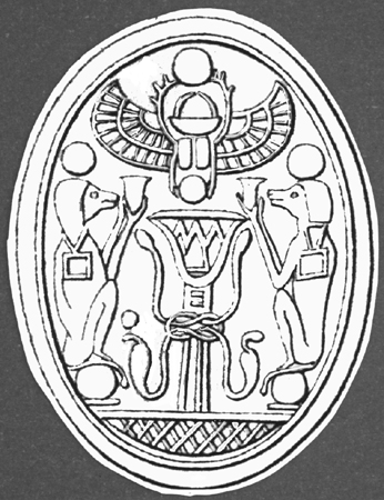 5/X2 Cagliari, from Tharros. Marmora, pl. A 30; Hölbl, Sard no. 19. Sardonyx. BL;EXnb. Two-winged beetle over a large lotus flower with entwined uraei and lotus buds (like the unification of the two lands sign); at either side apes, disc-crowned, holding beakers?, sitting on sn rings.