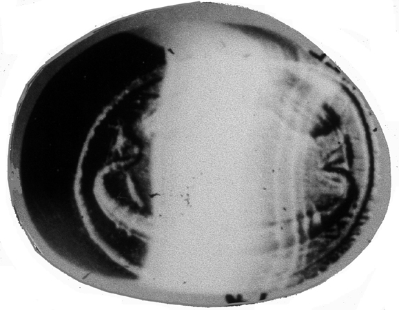 8/X1 Cagliari 19730, from Tharros. Bresciani 18, pl. 1b (Acquaro). Agate scaraboid pierced across short axis. BL. Unfinished. Boat with flower finials; winged disc above; the centre empty.