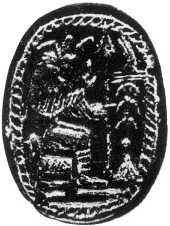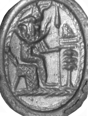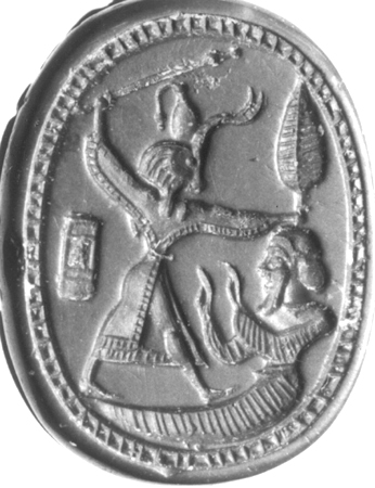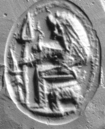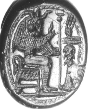 21/X2 Paris, BN 1055. Abr-Nahran 2 (1960-1) 49, fig. 1f (Culican); RSF 4 (1976) pl. 8.2 (Culican); Babelon, pl. 5. Agate. BL;EXnb. Sphinx throne; tasselled cap; spear sceptre; incense-burner.