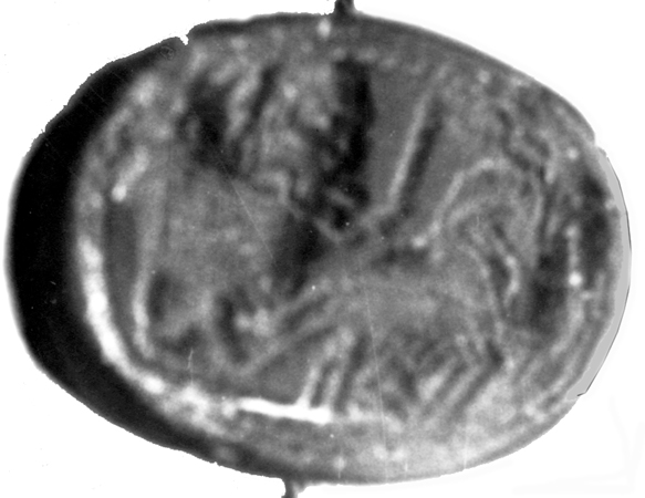 23/X1 From Kamid el-Loz. RSF 16 (1988) pl. 32b (Gubel); Kamid el-Loz III (1999) pl. 33.4; XV (1996) no. 69. Glass scaraboid. Dog before, lion behind, disc-and-crescent above.