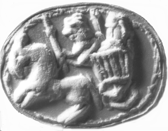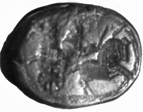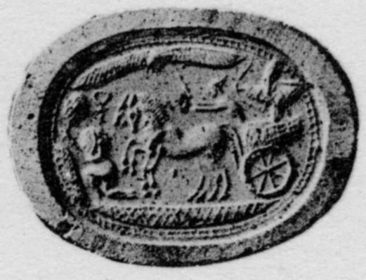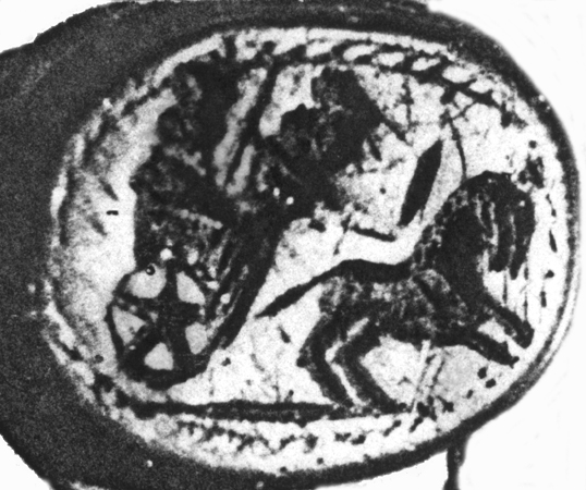 The normal type is of two figures in a cart-like chariot drawn by two horses. The foremost figure holds a goad upright. The type and its Cypriot origins are discussed by E. Gubel, RSF 16 (1988) 160-163. It derives equally, it may be, from older Mesopotamian scenes in which a lion hunt is in progress, with the lion generally leaping up behind the chariot, and is particularly common on glass scaraboids of our period in the east. Contrast the scene on the Egyptian green jasper scarab, de Clercq no. 2705, pl. 18.
