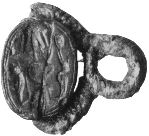 2/3 Cagliari 4, from Tharros. Ebers, pl. F 24; Hölbl, Sard.no. 8 BL; in gold mount with plain tongues holding stone, and hoop B. The disc has rays; winged disc above, not a crown. V
