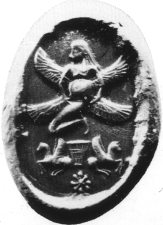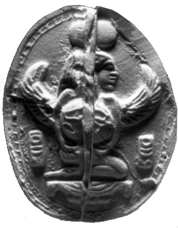 2/X6 Once Pierides Coll., Cyprus. AJBA 1 (1968) 97, pl. 5C (Culican). Material/shape? Four-winged kneeling figure holds disc; below, two winged horses flank a basket and star.