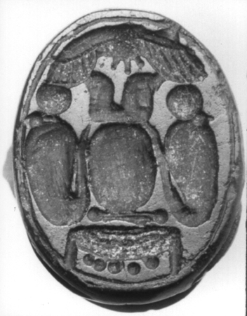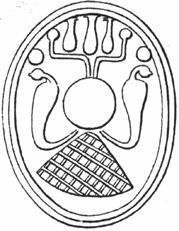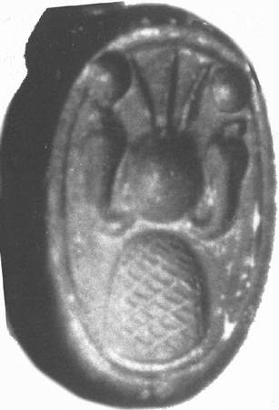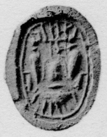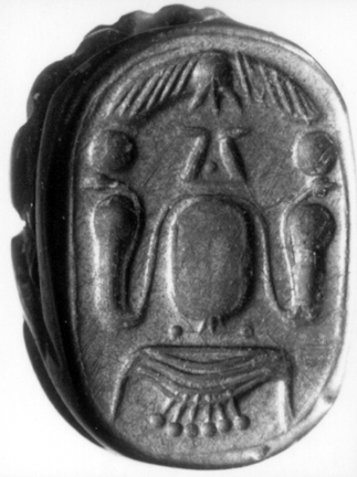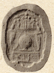 2/X1 Clay bulla, from Carthage. Cahiers de Byrsa 2 (1952) 47, no. 772. EXnb. Beetle in cartouche; feather and disc crown; uraei at each side; winged disc above.