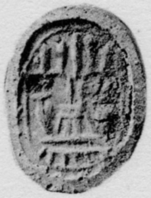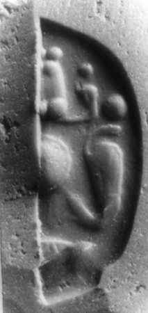 2/22 Paris, Bibl.Nat., de Clercq no. 2571, pl. 17 (E 25880), from Byblos. BL. hmhm crown?, flanked by disc-crowned uraei; over nbw. VI
