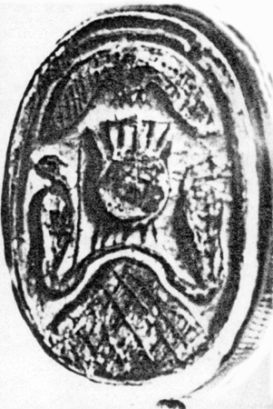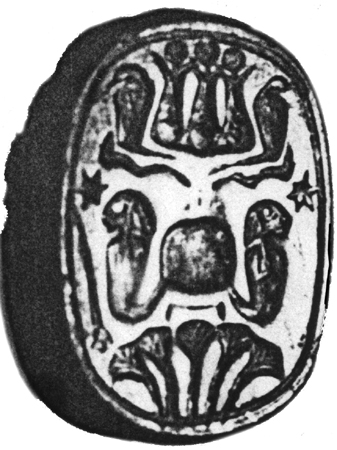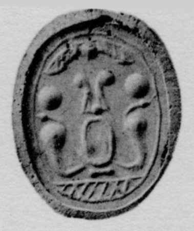 2/12 Busacchi Coll., from Tharros. Ebers, pl. F 12; Quillard, pl. 25.2; Hölbl, Sard no. 7. BL. hmhm crown with small winged disc above; uraei with disc crowns; below, a rectangle with hieroglyphs.