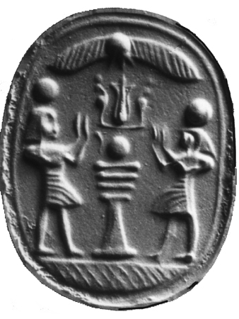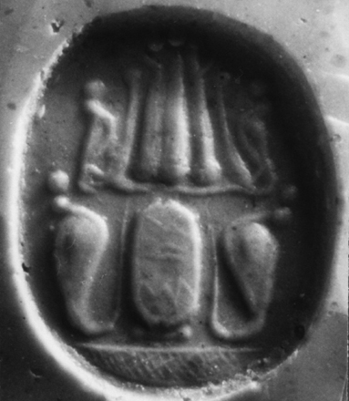 2/X10 Paris, Louvre AO 10396, from Phoenicia. F. Tallon, Les pierres précieuses de l'Orient ancien (1995). Blue chalcedony. BL. On a boat with disc-crowned ram-forepart terminals; on a hatched base flanked by uraei, with an atef crown.