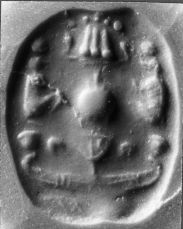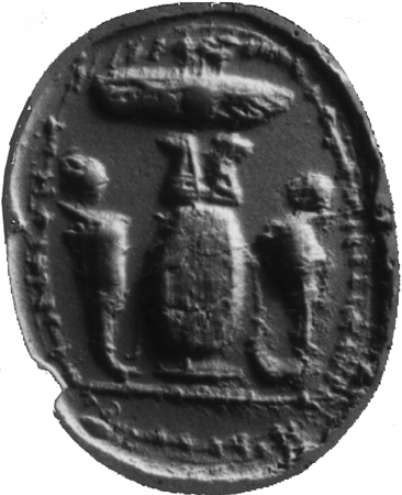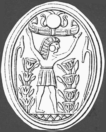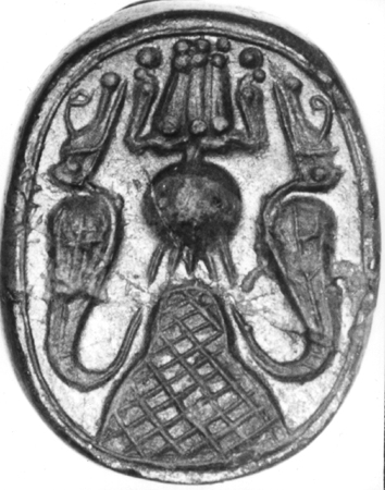 2/26 Pres. Ena Coll., from Tharros. Marmora, pl. A 46; Orientalia 58 (1989) 319, fig. 1b (Gubel); Hölbl, Sard no. 13. BL;EXnb. Figure in short skirt holds boat aloft; disc flanked by uraei; boat with lotus ends. At either side of the figure a quadruple lotus-and-buds bloom and a waz sceptre. See Gubel, loc.cit. for Egyptian parallels to the boat-bearing figure.