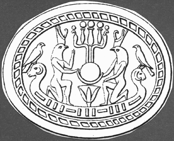 2/X7 Boglioli Coll. from Tharros. Marmora, pl. A 24; Hölbl, Sard no. 17. Cornelian in gold mount. BH. Two falcon-headed kneeling figures on a boat with ram-head ends and falcons upon them. They hold a disc with hmhm crown.