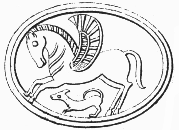 35/X2 Caboni Coll., from Tharros. BAS 7, 127. Agate in gold mount. Winged horse and dog.