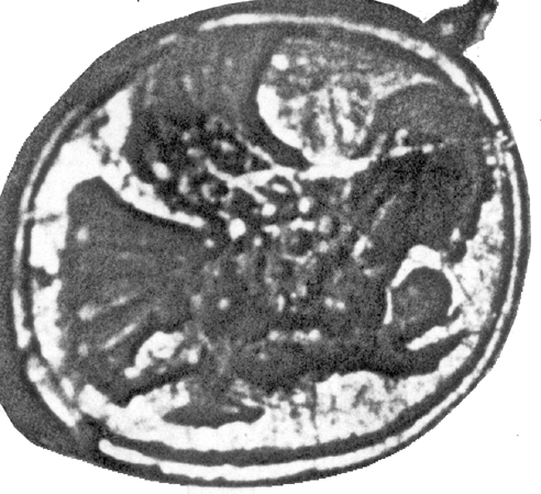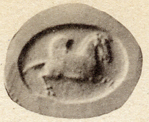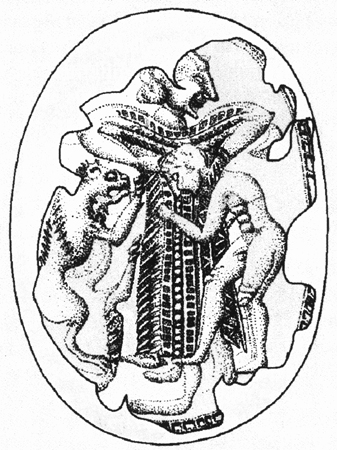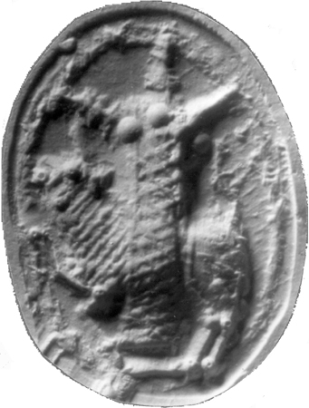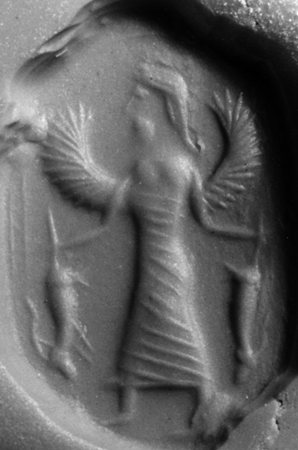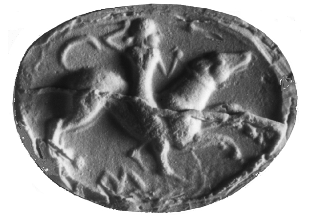 35/23 Paris, Louvre AO.11238, bought in Aleppo. BL; ridge carination. Woman with two wings holding two goats inverted. This might be Greek. Compare the figures on Lydo-Persian stamps, Iran 8 (1970) pl. 2.23-25, and AGGems 35. V