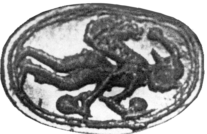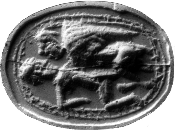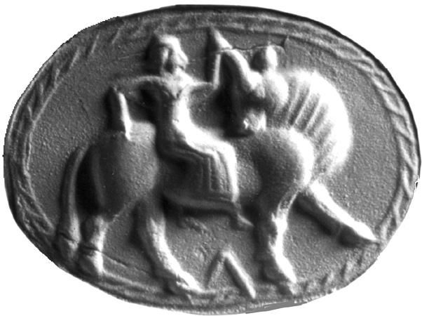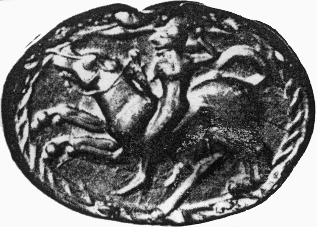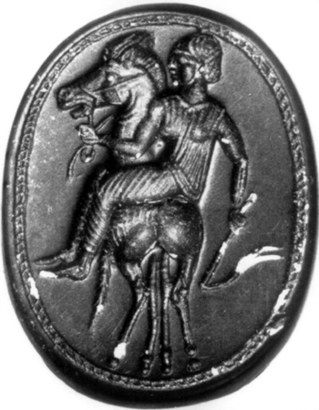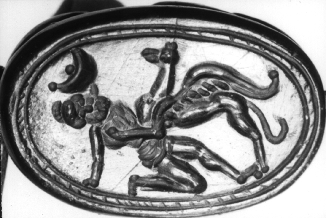 The subject is common on late archaic and classical Greek scarabs and rings.