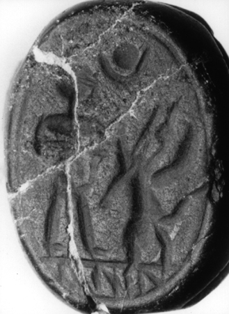 35/22 Oxford III, no. 474 (1941.71), bought in Jerusalem. BL;EXV. Figure facing a small rearing griffin. Disc-and-crescent above.