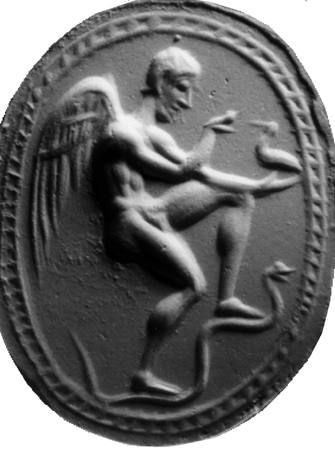 35/X5 Carthage no. 676. Fest.Hausmann pl. 66.5. Cornelian. BH. Winged youth holding a bird which he feeds (?), climbing up a snake, bent as two steps. I
