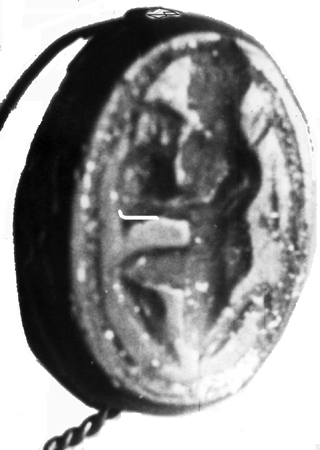 32/4 Tharros pl. 63.d (BM ANE 133402), London no. 395. AG pl. 7.56; Boardman, GO fig. 255a; RSF 18 (1990) pl. 4.3 (Acquaro); Hölbl, Sard no. 246. BL;PB;EXCR. As the last, including the sceptre, and with a blank cartouche behind. I