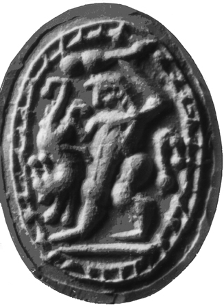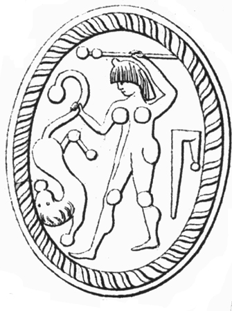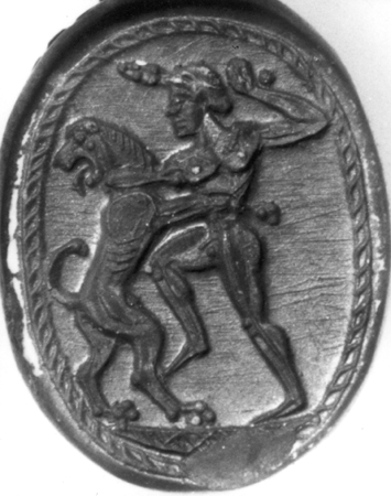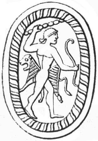 Most, logically if Herakles, avoid the lionskin (clearly not on some); and all figure vertically behind the hero the figure of a running animal (dog) or some other, possibly animal, motif. Most of the heroes are youthful. The scheme is an eastern one deriving from that for the master of animals, and not uncommon with Bes. It was not generally adopted in Greece for Herakles and the lion, except in glyptic, where the motif was probably more directly derived from the east (AGGems nos. 297-8).