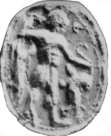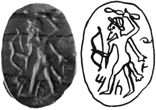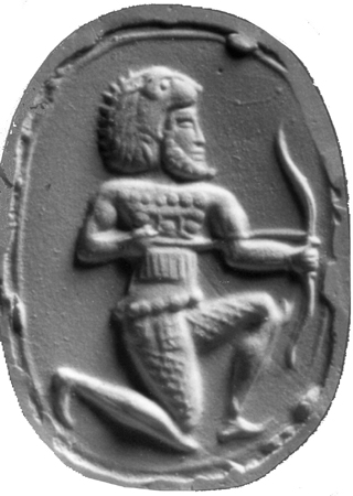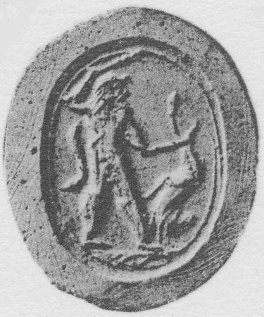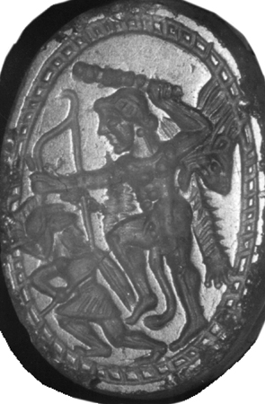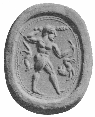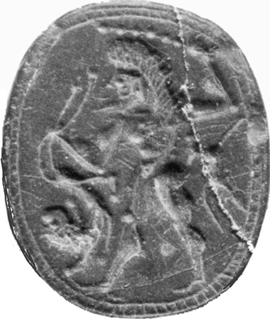 32/5 Paris, BN, Pauvert no. 79, pl. 6. Cut scarab (?). Wears lion head, corselet with collar (?) and lappets (cf. the warrior, Tharros pl. 62g), thighs covered with guard or dress, greaves? Drawing bow. Cf. Ibiza no. 190. III