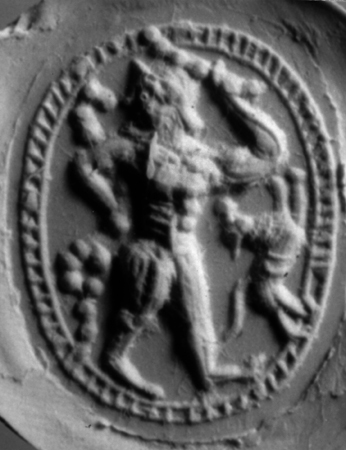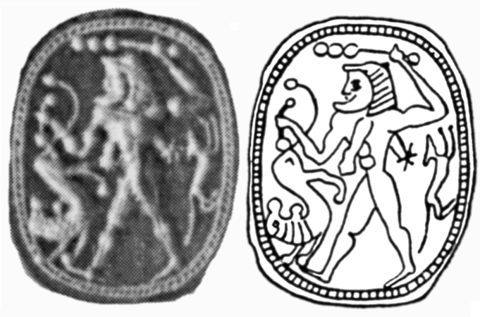 The scheme was oriental but adopted in Greek art for Herakles at an early date and it is the archaic Greek wrestling type that appears here.