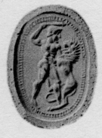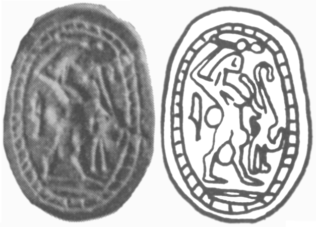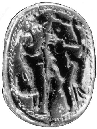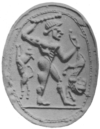 32/X12 Paris, Bibl.Nat., de Clercq no. 2806, pl. 19. Cornelian scaraboid. BH. Beardless, raised club.