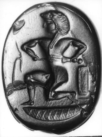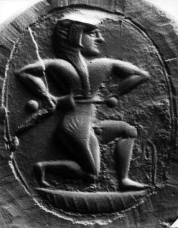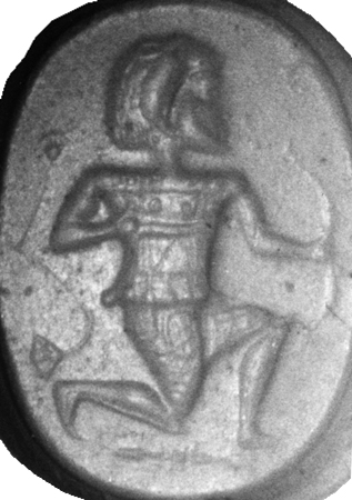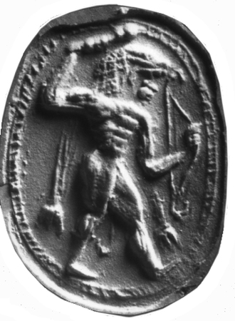 32/X1 Geneva I, no. 149 (20254), pl. 61, from Egypt. RSF 18 (1990) pl. 4.1 (Acquaro). Cornelian, carinated. BH;EXCR. Kneels with skin, bow, arrows.